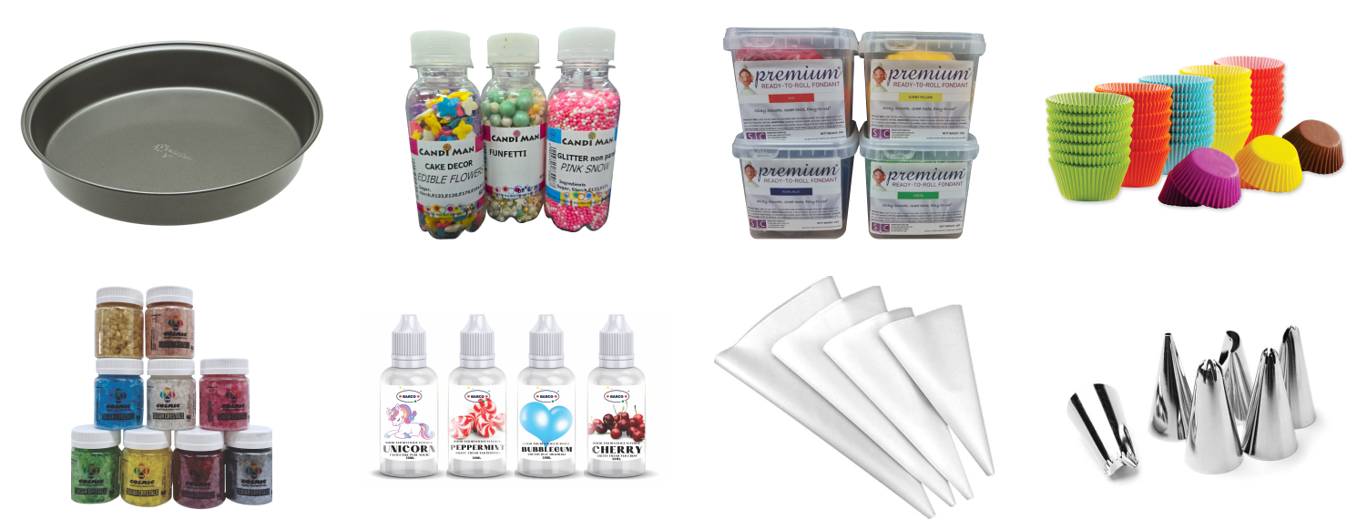 From: • CAKE PANS • WIDE VARIETY OF SPRINKLES • PIPING BAGS • CUPCAKE CUPS • PIPING TIPS • MODELING TOOLS • FONDANTS & ICING • AND LOADS MORE