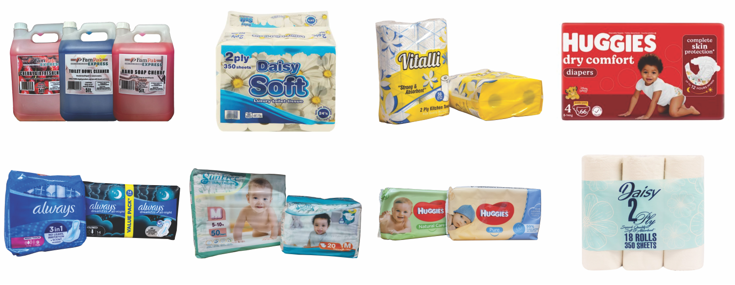 From: • BABY DIAPERS • WOMEN HYGIENE • BABY WIPES • TOILET PAPER • HOUSEHOLD CLEANING CHEMICALS • AND LOADS MORE